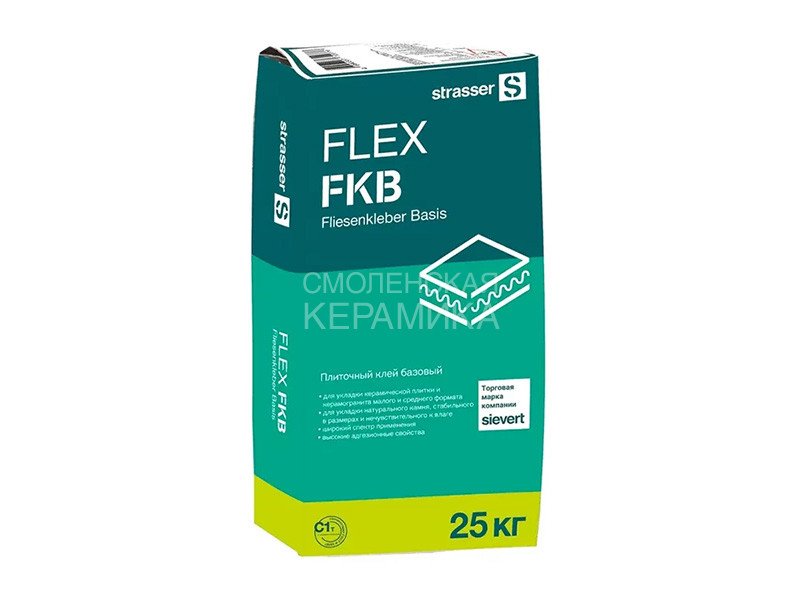 Плиточный клей базовый strasser FLEX FKB применяется для укладки керамогранита, натурального и искусственного камня, керамической плитки и мозаики. Клей FLEX FKB используется для укладки облицовки на пол и стены, размер облицовки снаружи помещений до 40х40 см, внутри помещений до 60х60 см. Укладку облицовочного материала можно выполнять на цементные, цементно-известковые, известковые и гипсовые основания, кирпичные и бетонные стены, гипсоволокнистые и гипсокартонные листы.