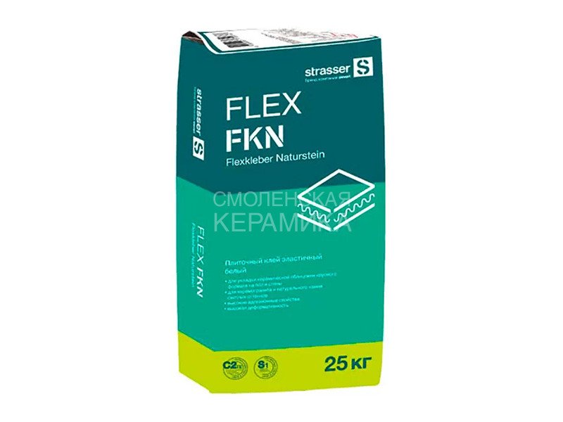 Плиточный клей эластичный strasser FLEX FKN белый применяется для укладки клинкерной плитки, керамогранита, натурального и искусственного камня, керамической плитки и мозаики. Клей FLEX FKN используется для укладки облицовки на пол и стены, размер облицовки снаружи помещений до 120х120 см, внутри помещений до 300х100 см. Укладку облицовочного материала можно выполнять на цементные, цементно-известковые, известковые и гипсовые основания, бетонные стены, гипсоволокнистые и гипсокартонные листы.